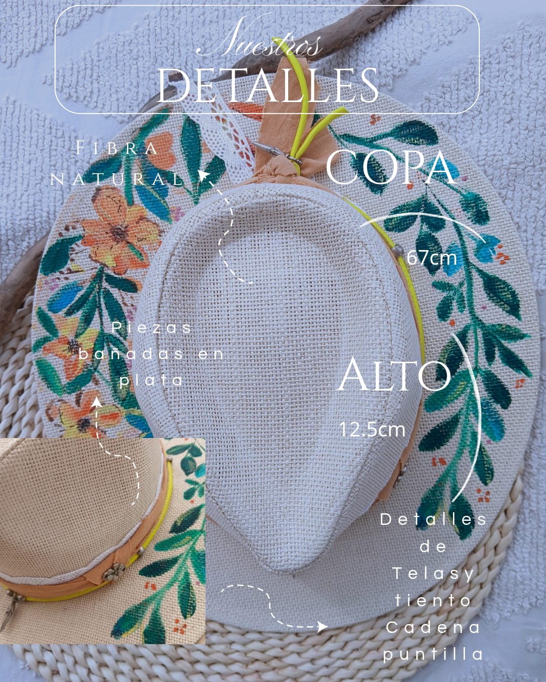 Este sombrero está pintado a mano con flores naranjas y verdes claros, evocando campos abiertos, pastizales en flor y la energía vibrante de la tierra viva. Lleva apliques inspirados en la playa, puntilla blanca que aporta suavidad y femineidad, y una cinta amarilla que suma luz, alegría y movimiento. Cada detalle dialoga con lo silvestre, lo simple y lo auténtico ✨🌾