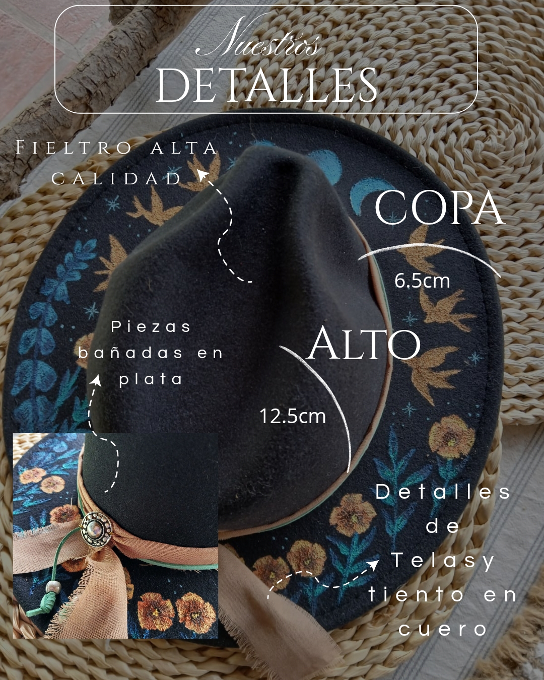 Cada pieza de Alquimia está creada para acompañarte con magia, presencia y belleza. Este sombrero fue intervenido a mano con un diseño inspirado en la naturaleza, los ciclos y la luz interior.